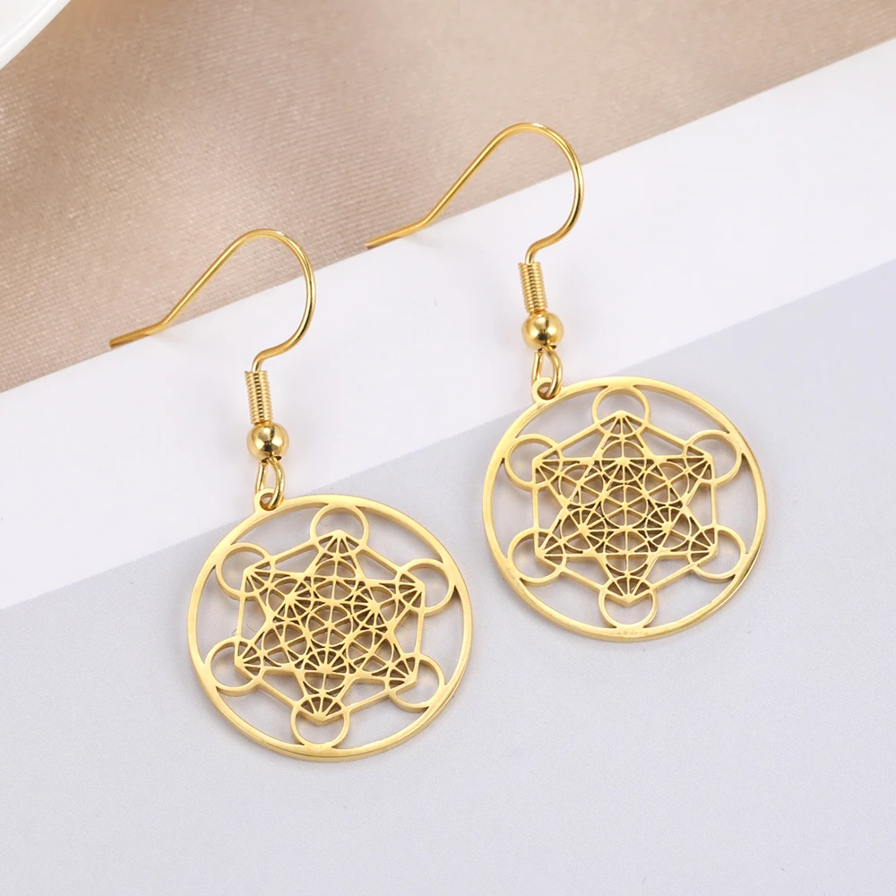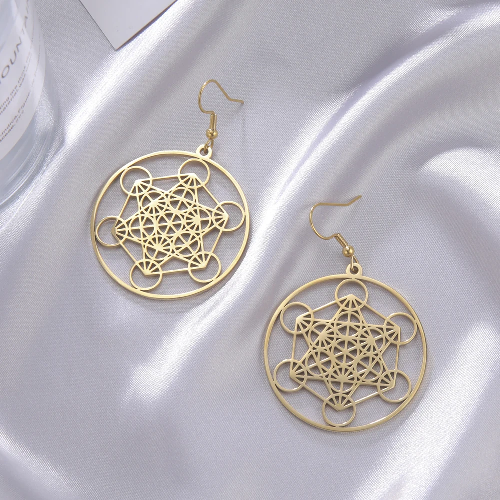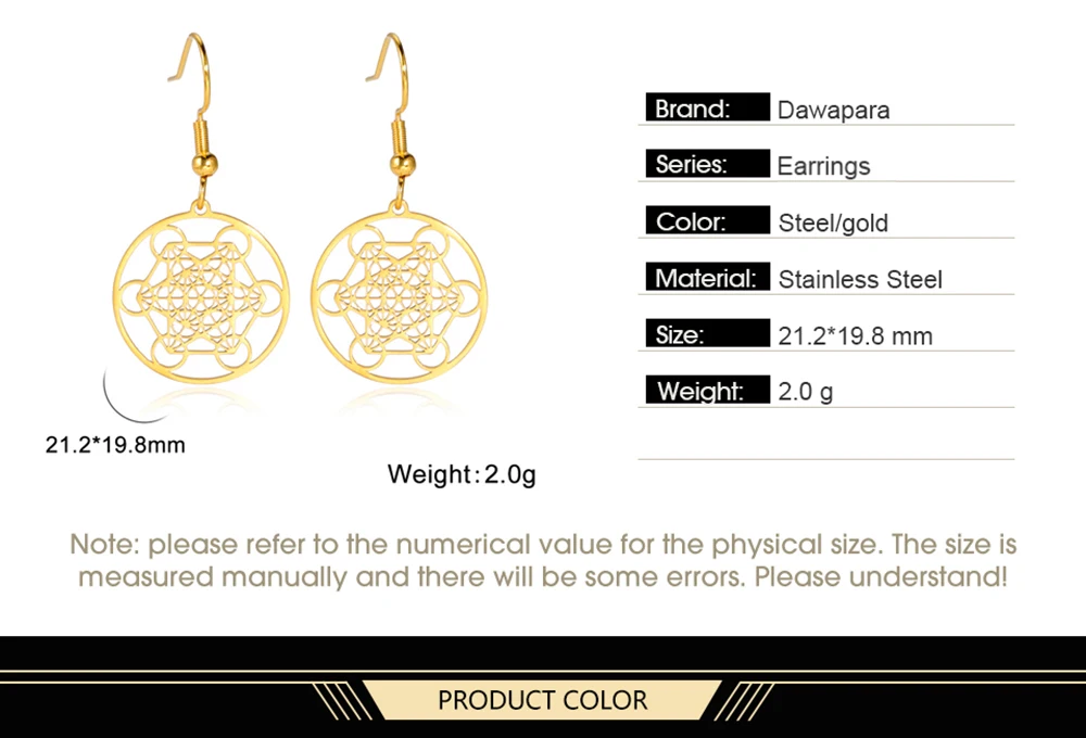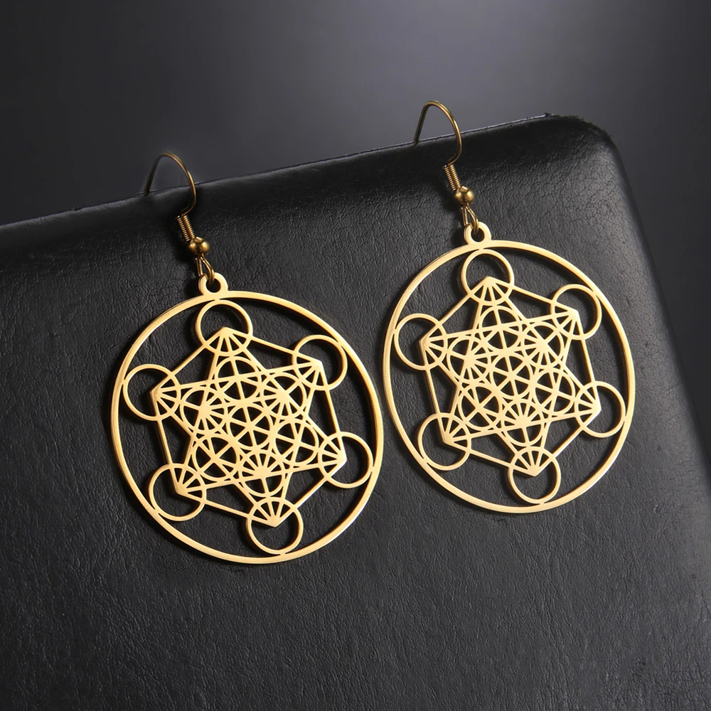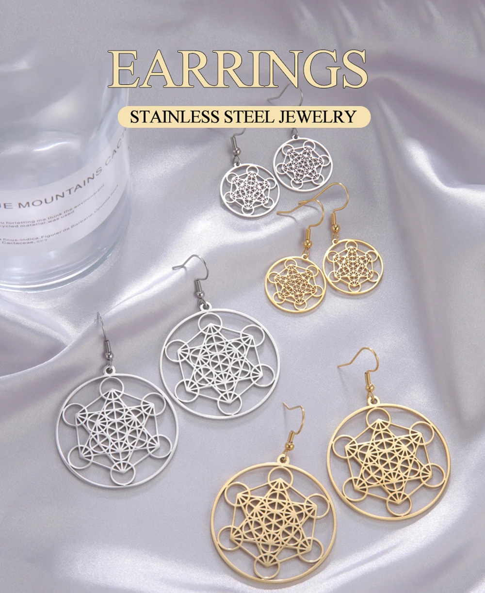 Metatron Cube earrings made of Stainless Steel of the highest quality, these beautiful earrings come in 2 possible measures 20mm and 38mm. Available in 2 colors: steel color or gold color. You can choose according to your preferences. This material is hypoallergenic and does not fade, nor does it stain the skin.
