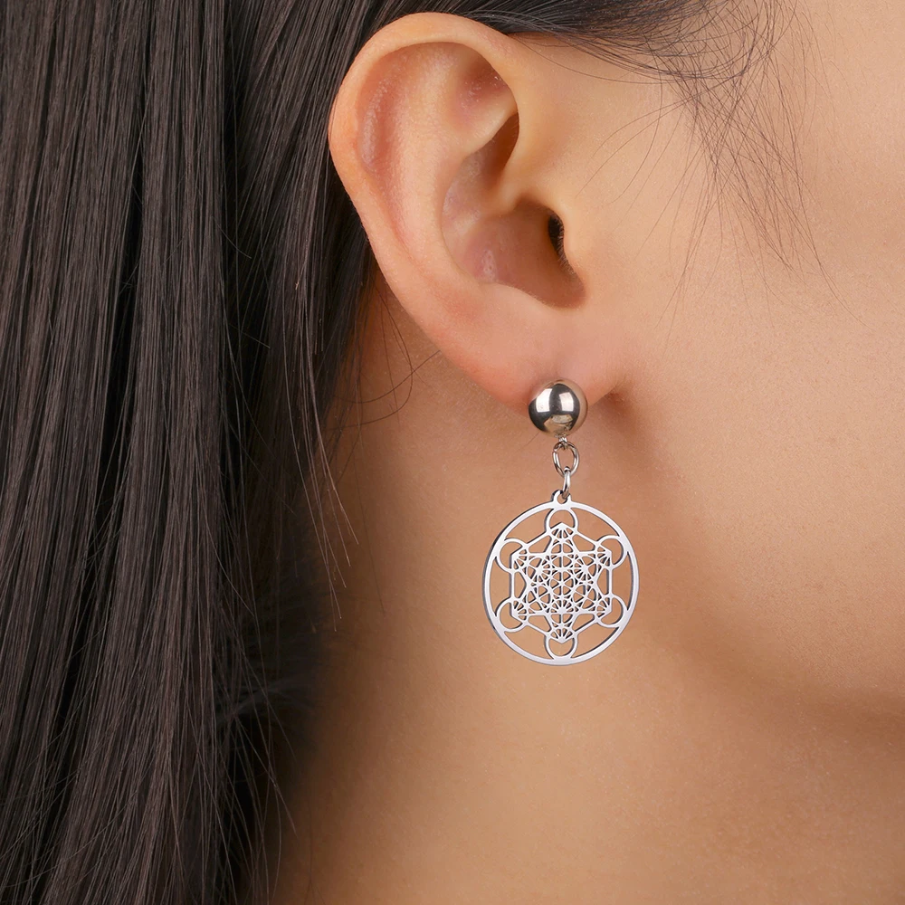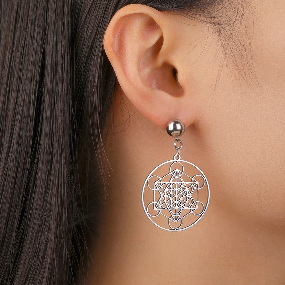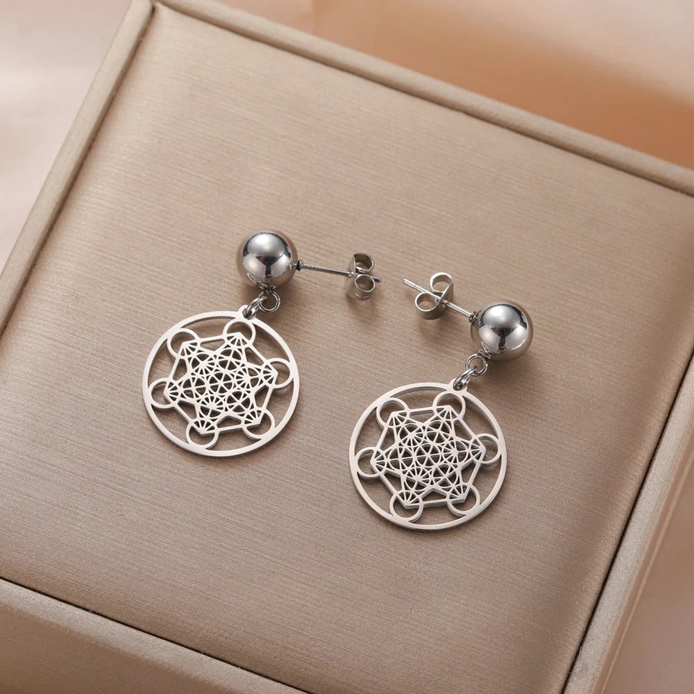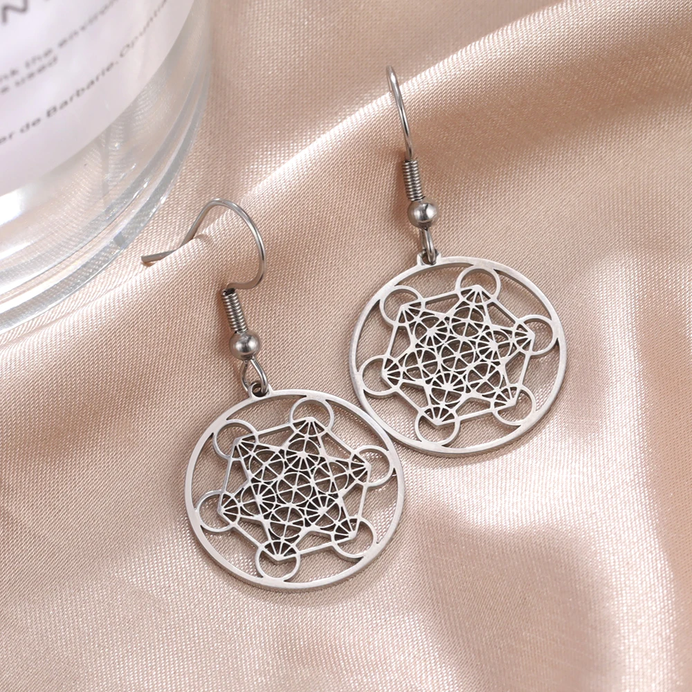 Metatron Cube earrings made of Stainless Steel of the highest quality, these beautiful earrings come in 2 possible measures 20mm and 38mm. Available in 2 colors: steel color or gold color. You can choose according to your preferences. This material is hypoallergenic and does not fade, nor does it stain the skin.