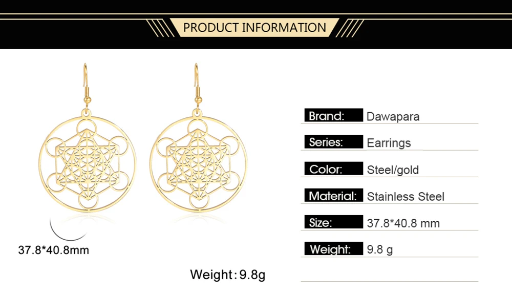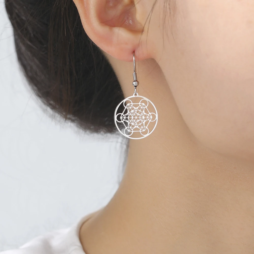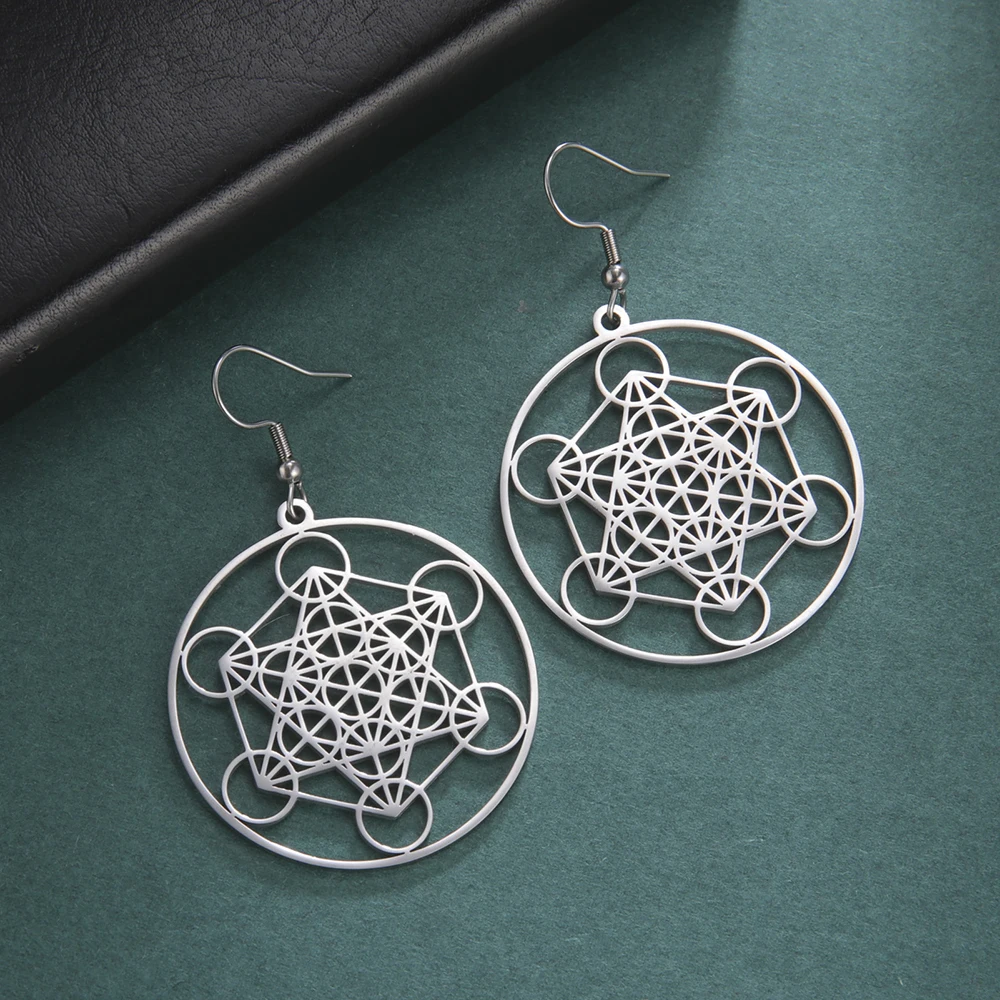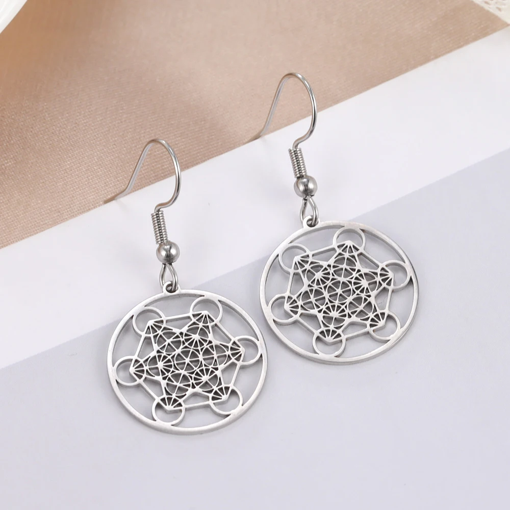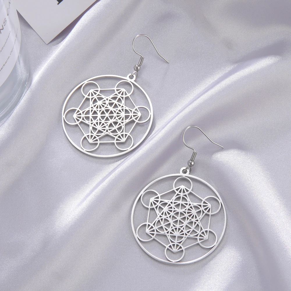 Metatron Cube earrings made of Stainless Steel of the highest quality, these beautiful earrings come in 2 possible measures 20mm and 38mm. Available in 2 colors: steel color or gold color. You can choose according to your preferences. This material is hypoallergenic and does not fade, nor does it stain the skin.